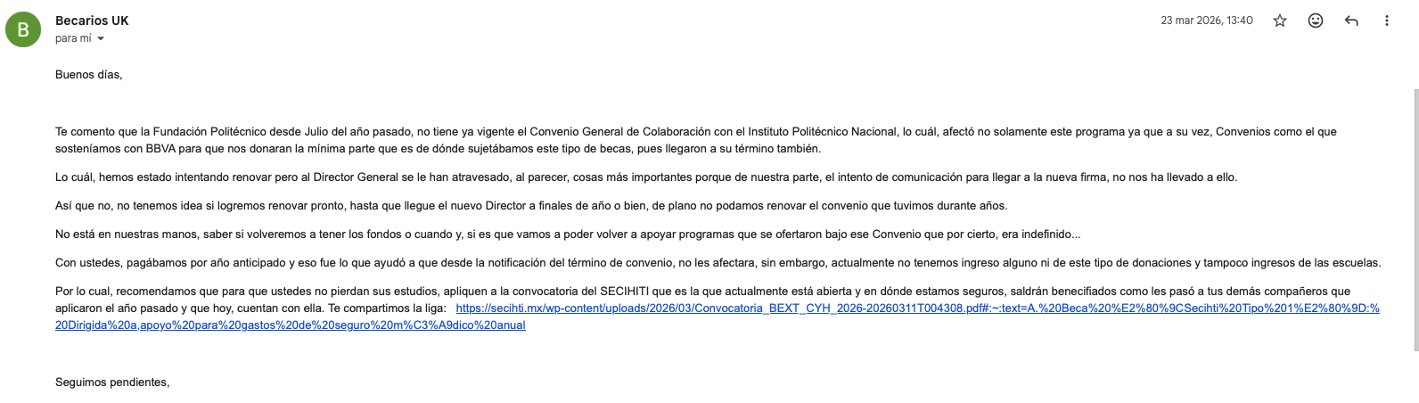 All 39 PhD researchers received formal notice from Fundación Politécnico stating that funding would be suspended 'temporarily and preventively' due to internal operational and financial issues. Subsequent communications referenced the breakdown of agreements between IPN and Fundación in August 2025. No timeline, contingency plan, or support measures were provided. They just recommended applying for SECIHTI scholarships.