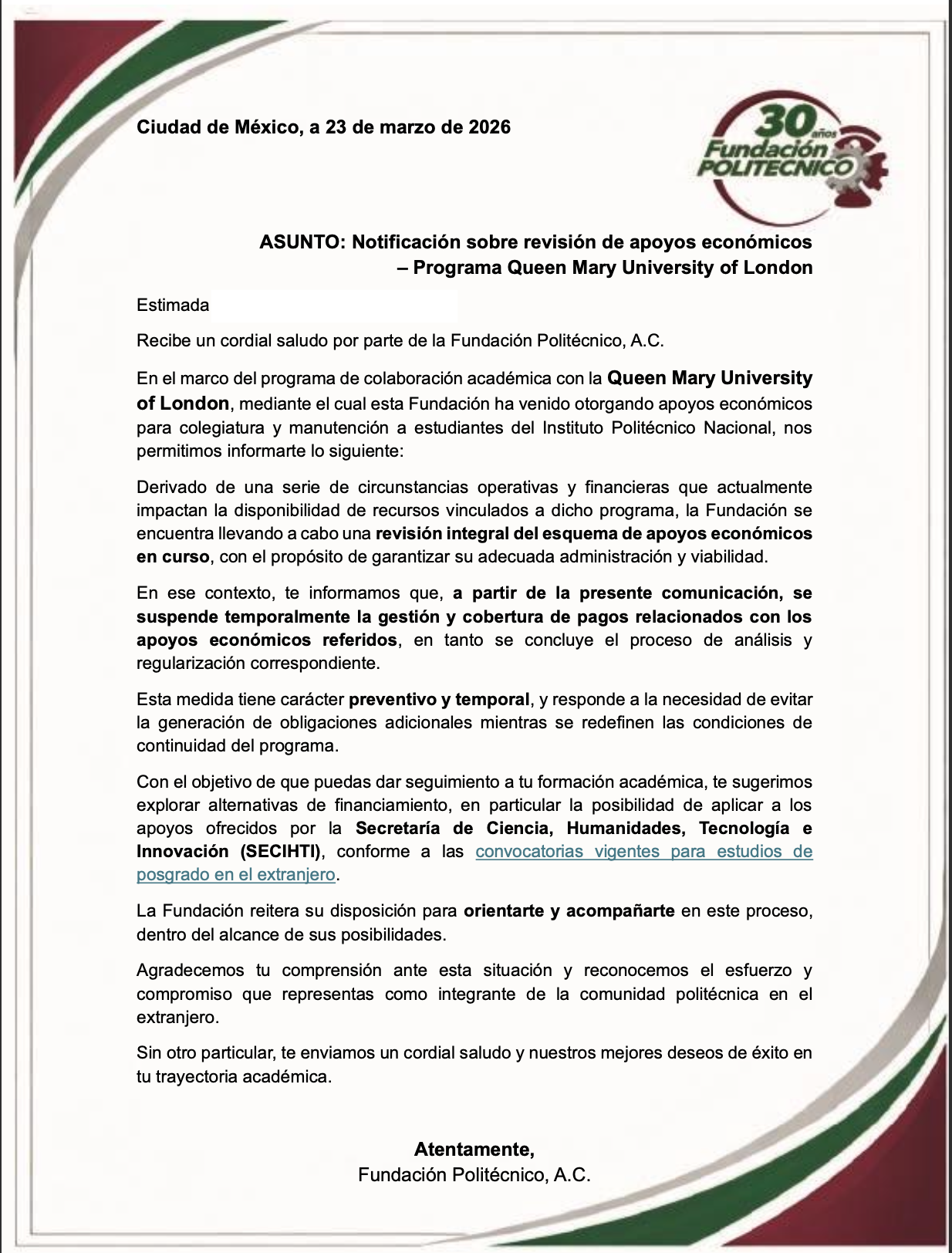 The 39 affected PhD researchers sent a formal collective letter to both Fundación Politécnico and the Instituto Politécnico Nacional demanding an urgent response, a restoration of funding, and a clear plan of action. To date, neither institution has replied.